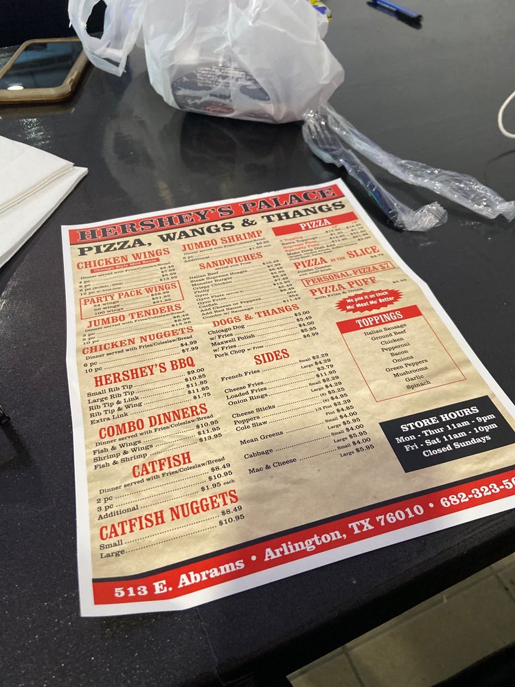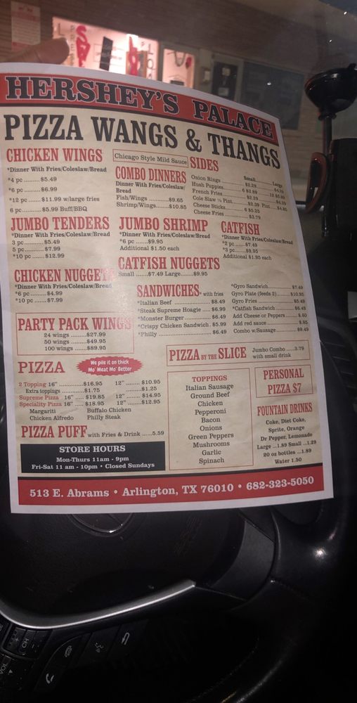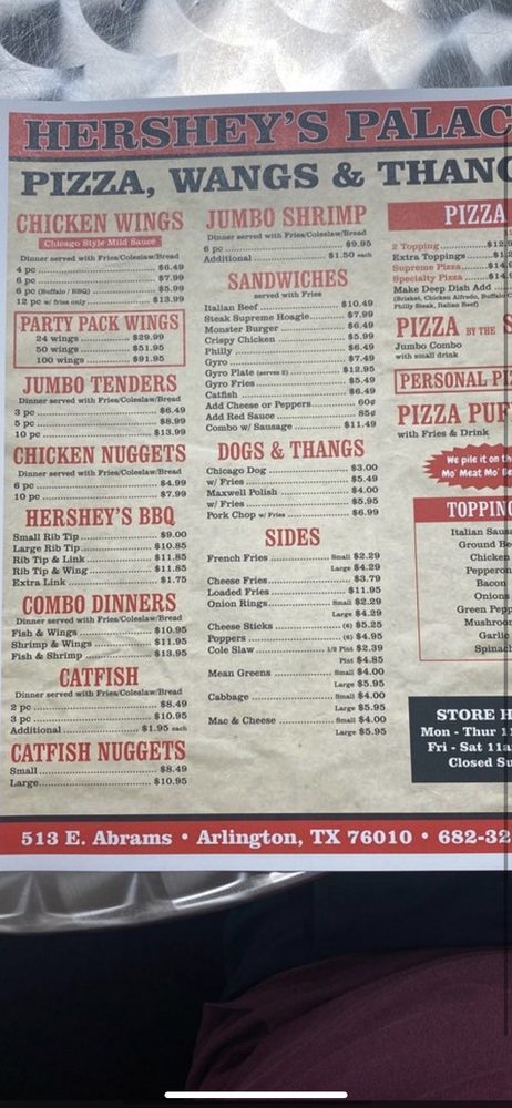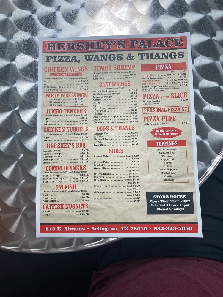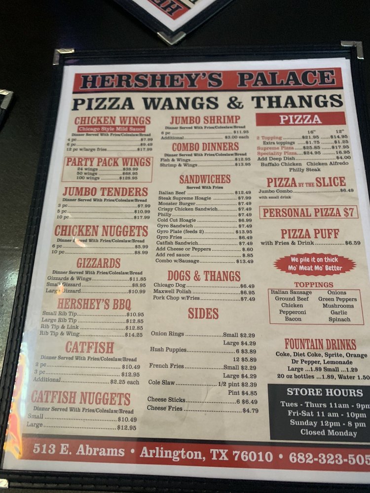 Introducing Hershey’s Palace, a cozy spot located in Arlington, TX offering a diverse menu of pizza, chicken wings, and American cuisine. The restaurant provides delivery, takeout, outdoor seating, and waiter service, making it suitable for all dining preferences. Customers rave about the fresh and delicious food options, with highlights including the 12pc Chicago style wings, Philly cheesesteak, and deep dish pizza. The jumbo tenders and chicken nuggets are also popular choices. With a casual yet classy ambiance, Hershey’s Palace is perfect for groups and even welcomes dogs. Reviews praise the prompt service and flavorful dishes, with particular mention of the seasoned fries and cozy atmosphere. Don’t miss out on a visit to Hershey’s Palace for a satisfying dining experience.
